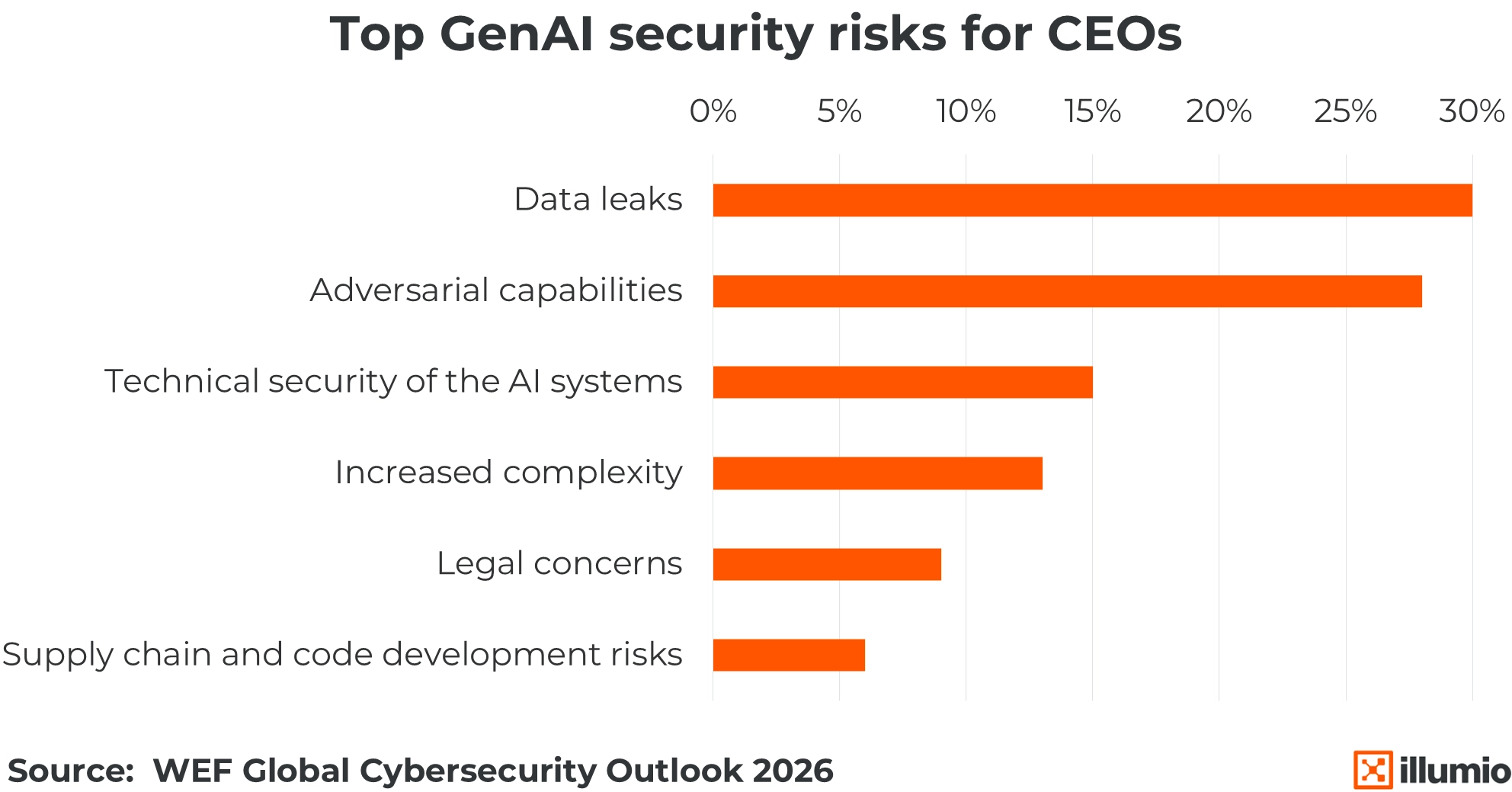 Nearly a third of CEOs rank data leaks as the top generative AI risk, with adversarial capabilities close behind. Technical security, legal concerns, and supply chain risks trail significantly. For security teams, this signals a shift in priority: reduce sensitive data exposure and limit attacker movement inside the environment before AI accelerates the impact.