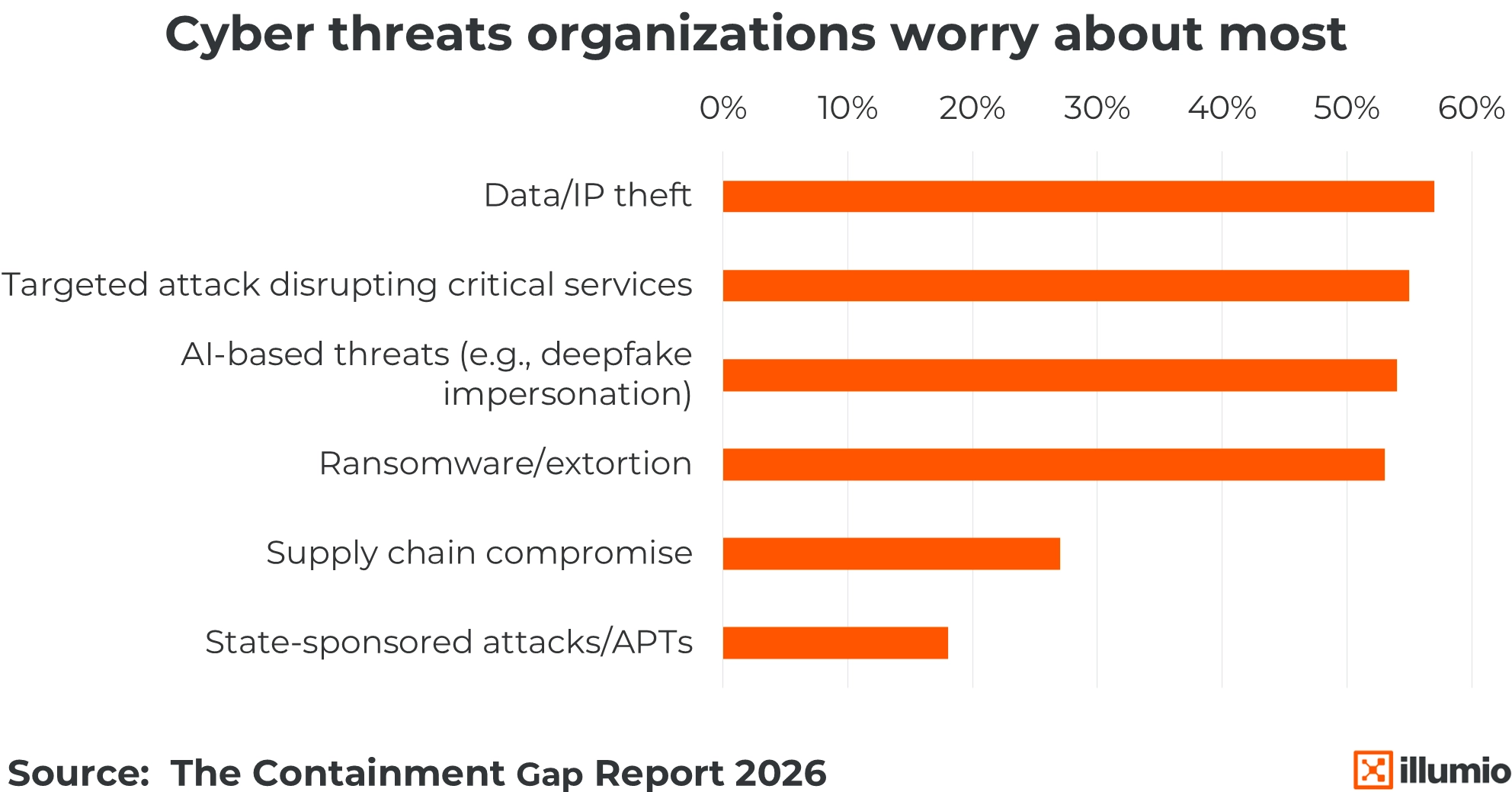 Organizations must balance several top concerns at once, not just a single threat. Data theft, targeted disruption, AI-driven attacks, and ransomware all rank nearly evenly. This shows how risk is spreading across multiple fronts rather than concentrating in one area. Beyond this top tier, concern drops off sharply, with supply chain compromise and state-sponsored attacks seen as less immediate concerns.