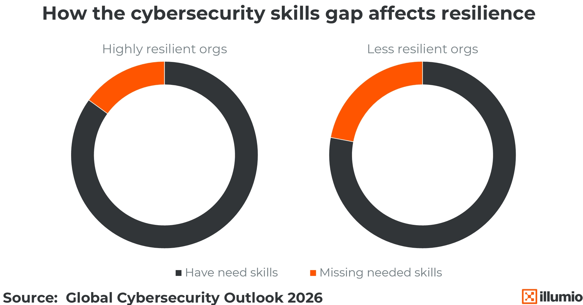 Cyber resilience rises and falls with the strength of the team behind it. Organizations with cybersecurity skills gaps report being less resilient. While highly resilient organizations show a very different pattern, with most saying they have the people and expertise they need. When skills are missing, resilience suffers.