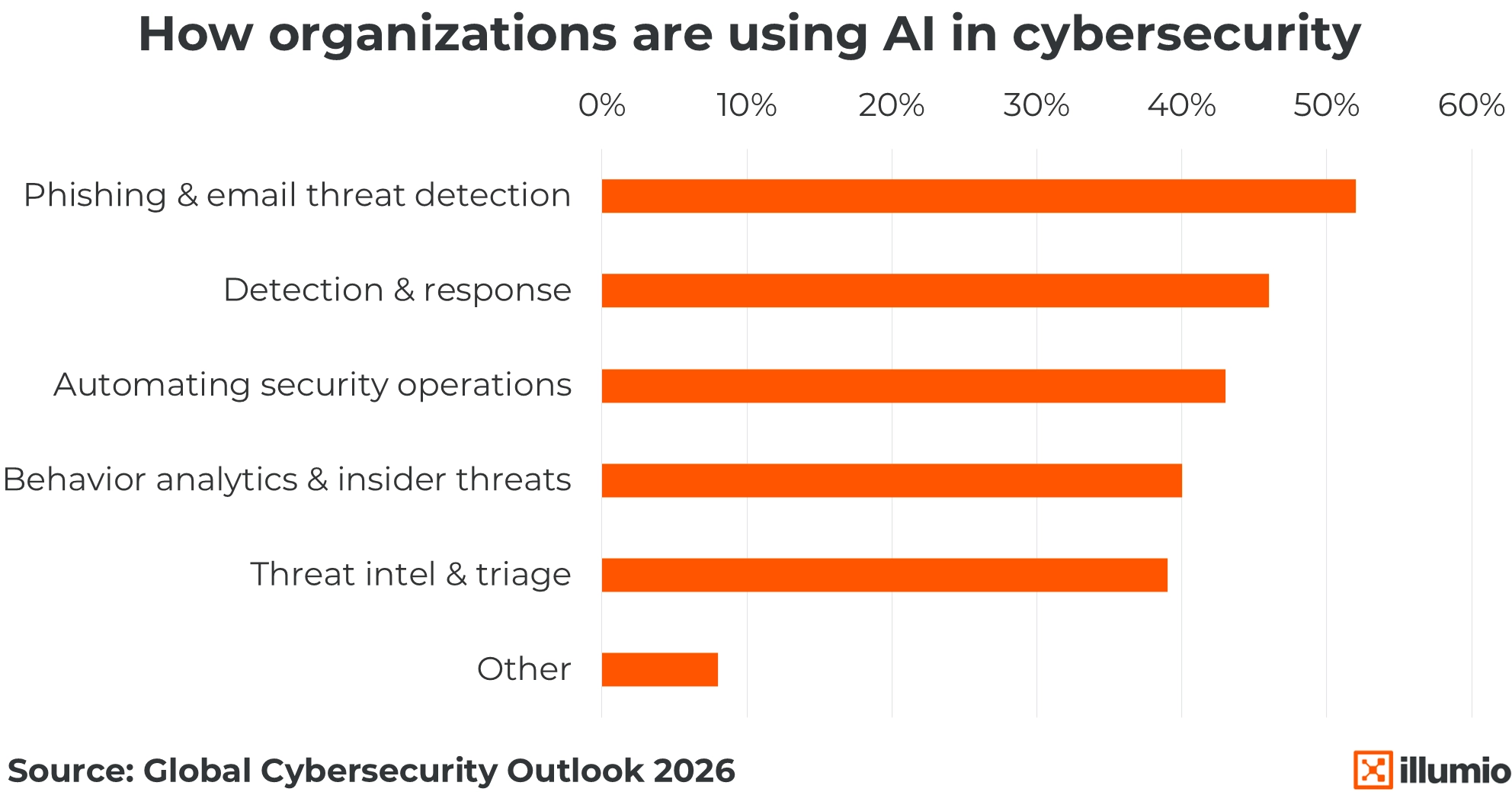 AI is becoming a frontline tool for cybersecurity teams. Its most common job: stopping phishing and email threats. Organizations are also using AI to detect suspicious activity, respond to intrusions, and automate routine security work that once consumed analyst time. Behavioral analytics and threat intelligence rank close behind, showing how quickly teams are turning to AI to surface patterns and prioritize risk faster.